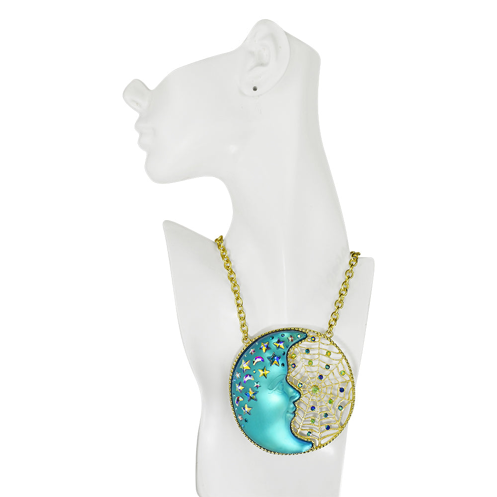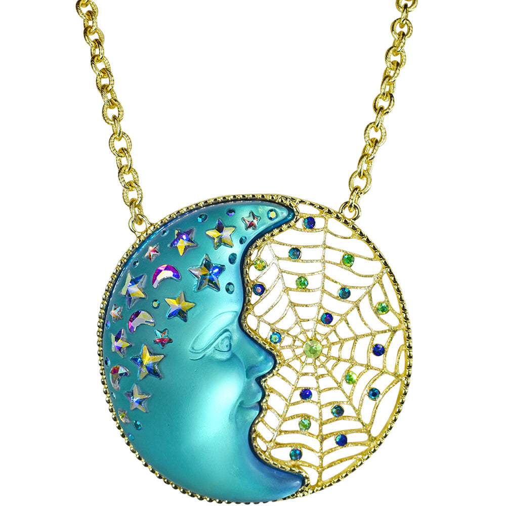 It’s magical, an ornament that can also be worn as a necklace, boasting a large sparkling color changing crescent moon stone and a twinkling metallic web.