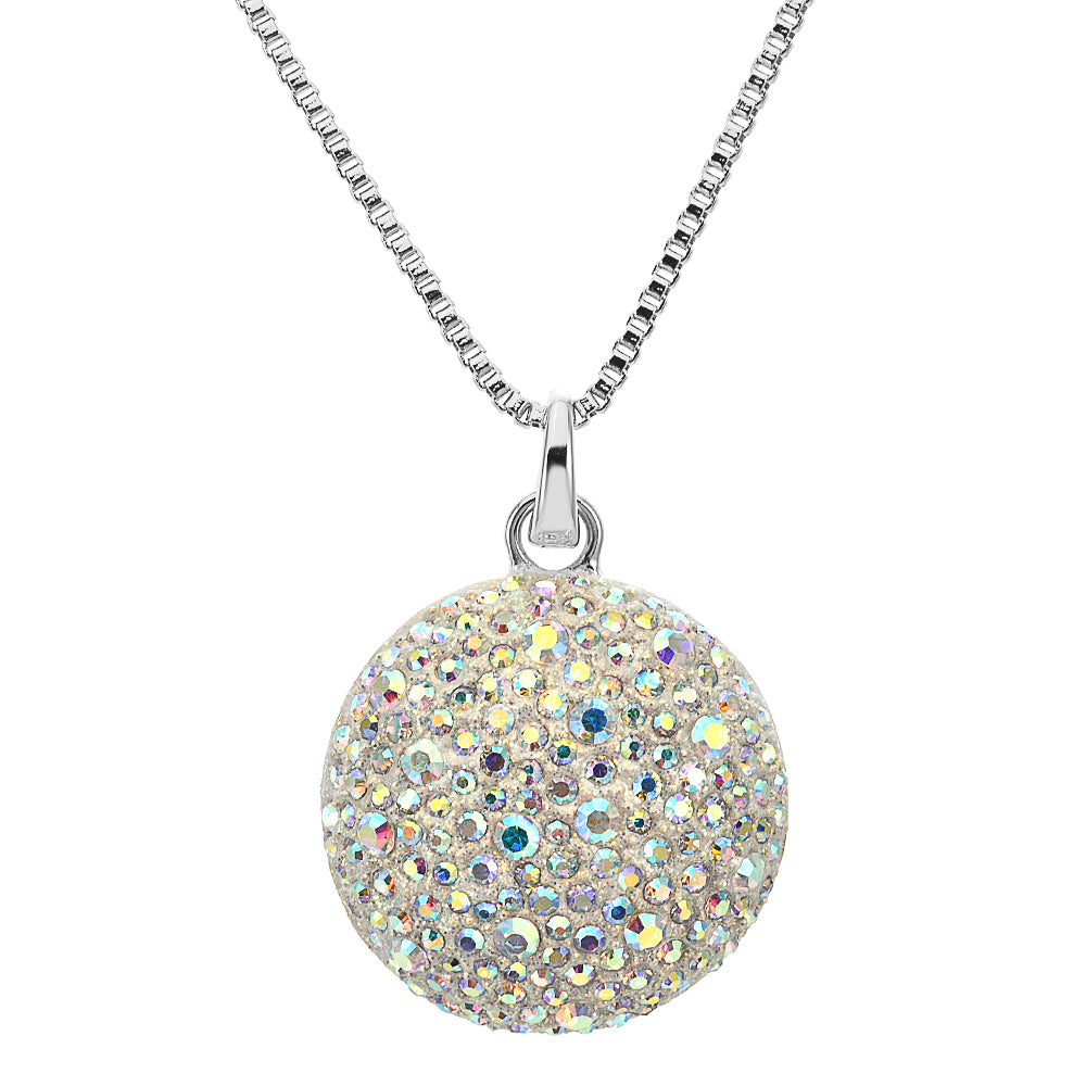 This lunar-inspired necklace features a full moon pendant encrusted with various-sized aurora borealis crystals, delicately arranged to mirror the moon's cratered and glistening surface.