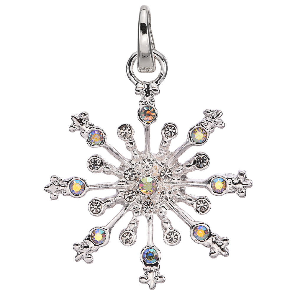 This open ring charm unveils a snowflake caught mid-flight, its intricate shape covered in white and aurora borealis crystals that catch the light like the morning frost.