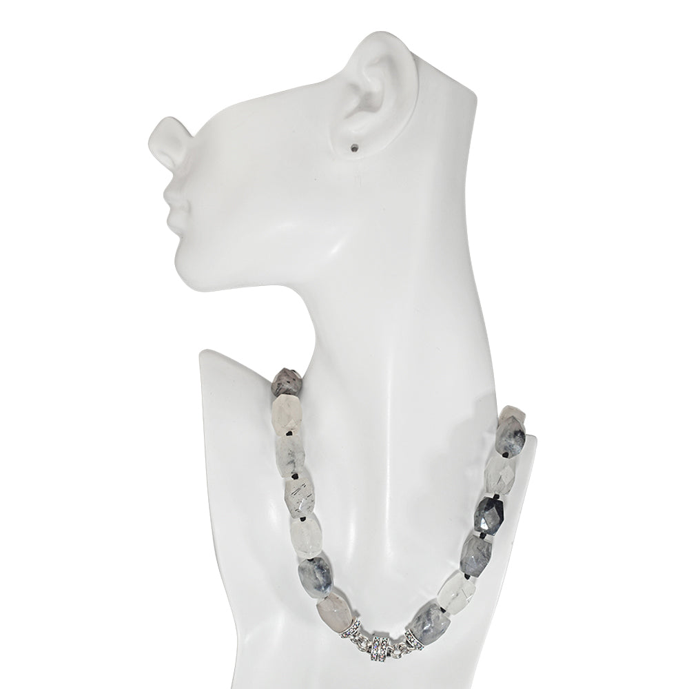 Each large, faceted gemstone bead, with its shades of grey, black and white, mirrors the natural beauty of crystal and shadow,