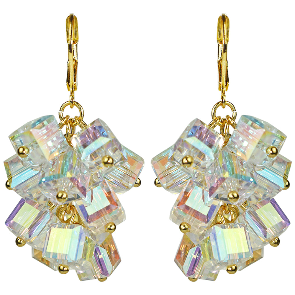 This double strand necklace and earring set shimmers with faceted square aurora borealis crystal beads, each glowing with mystical hues.
