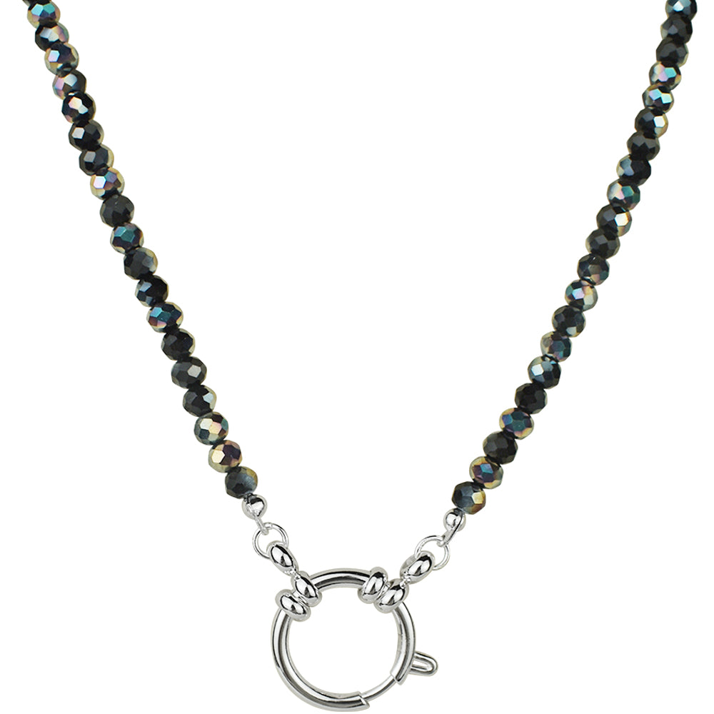 Crystallized 4mm Beaded Sailor Clasp Spring Ring Charm 18" Necklace (Sterlilng Silvertone/Black Magic AB)