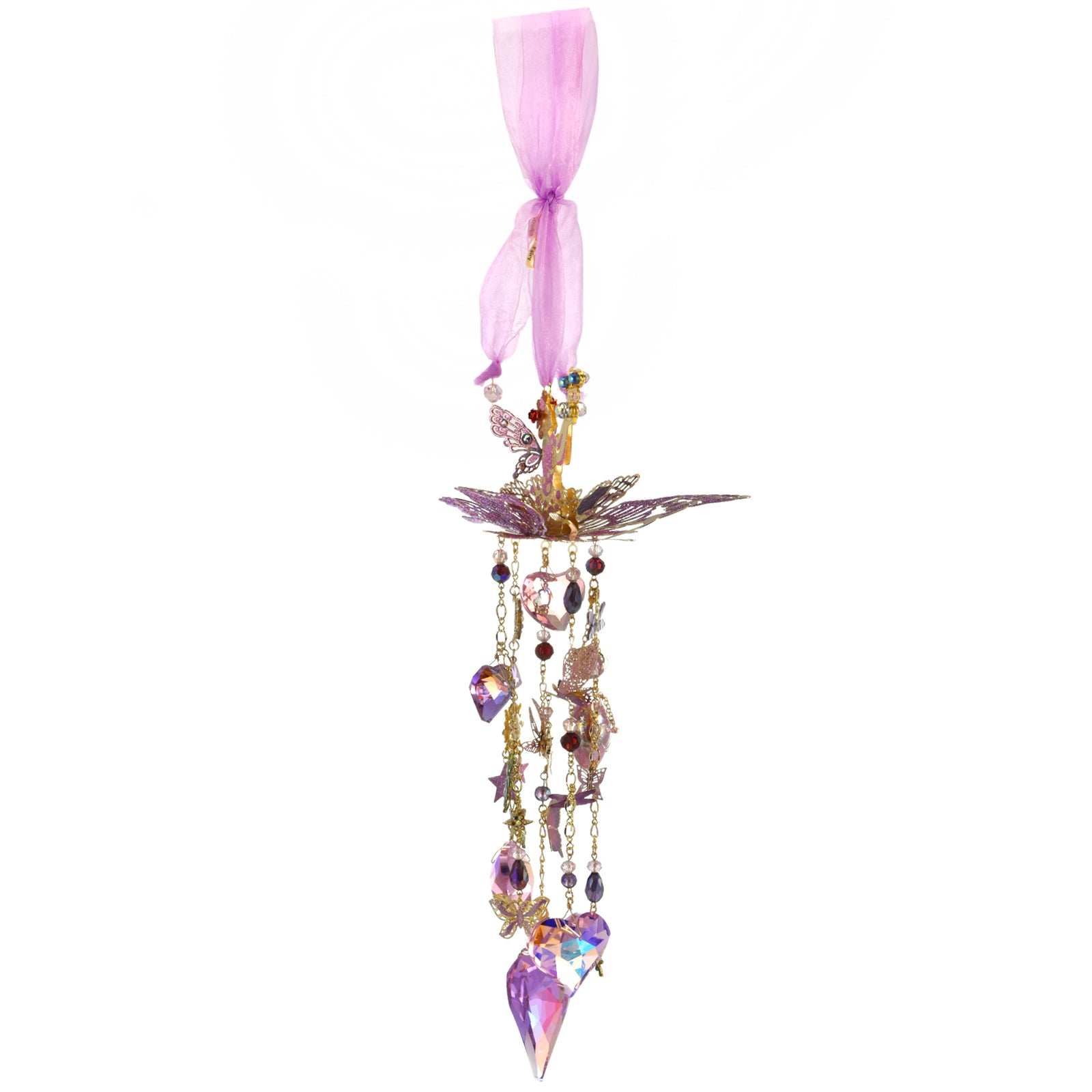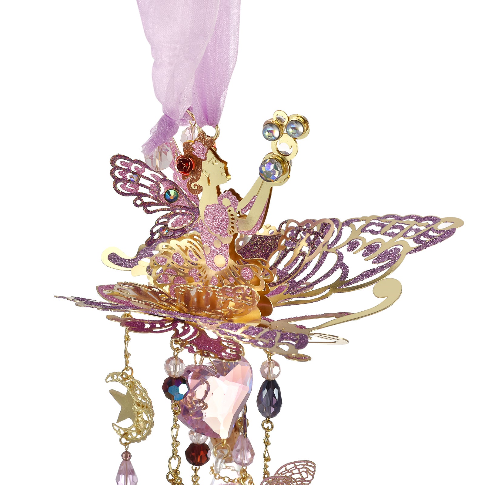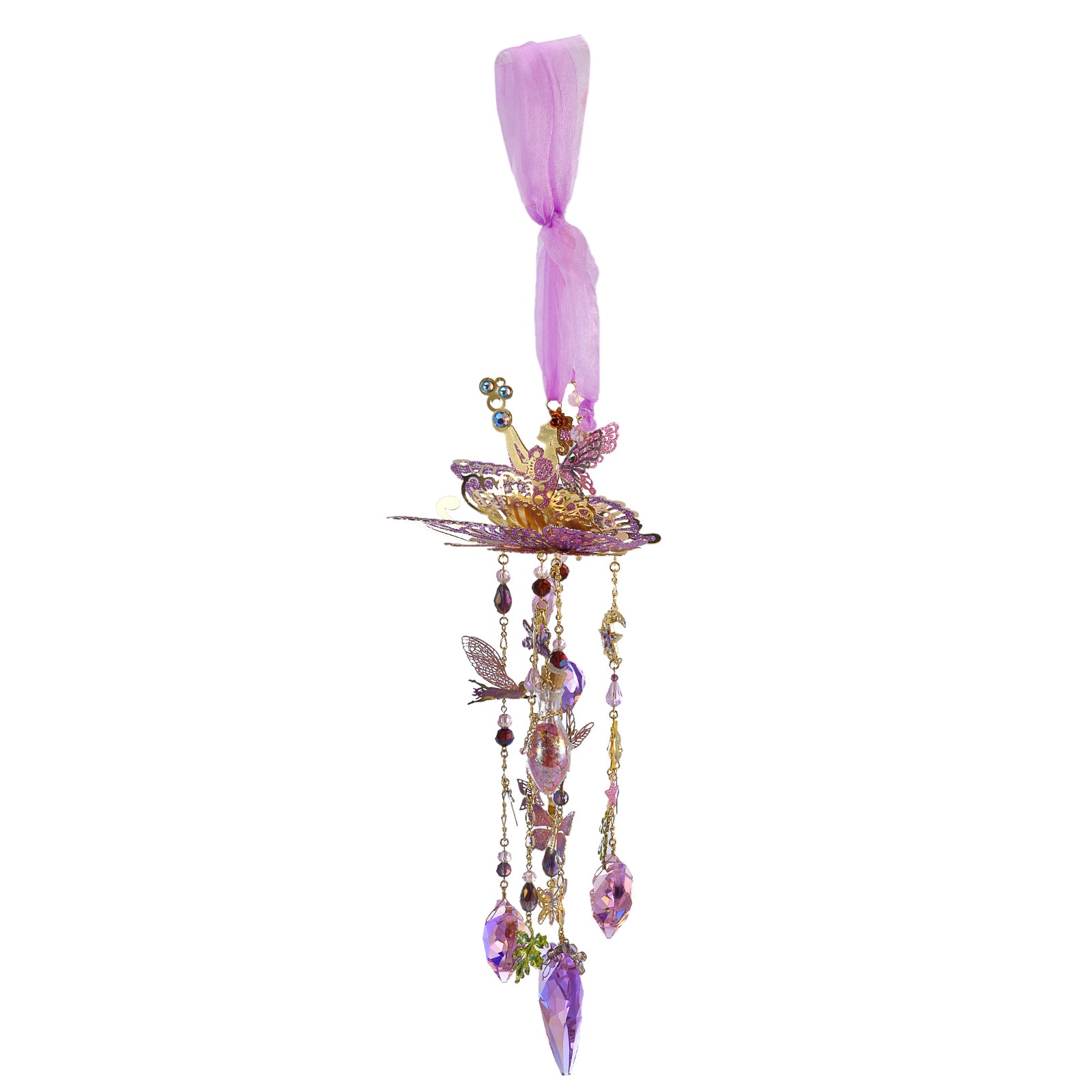 The fairy catches the sparkle of faceted crystals and the twinkling melody of delicate charms that hang below.