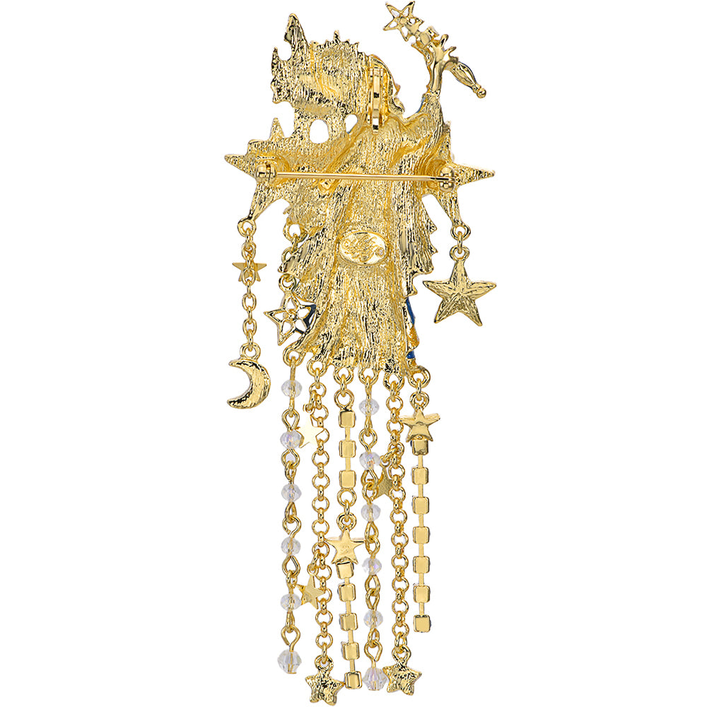 Cloaked in cosmic mystery, the Wizard King gazes from the heart of this pin pendant, his form encircled by crystal-encrusted stars and moons that shimmer like ancient spells.