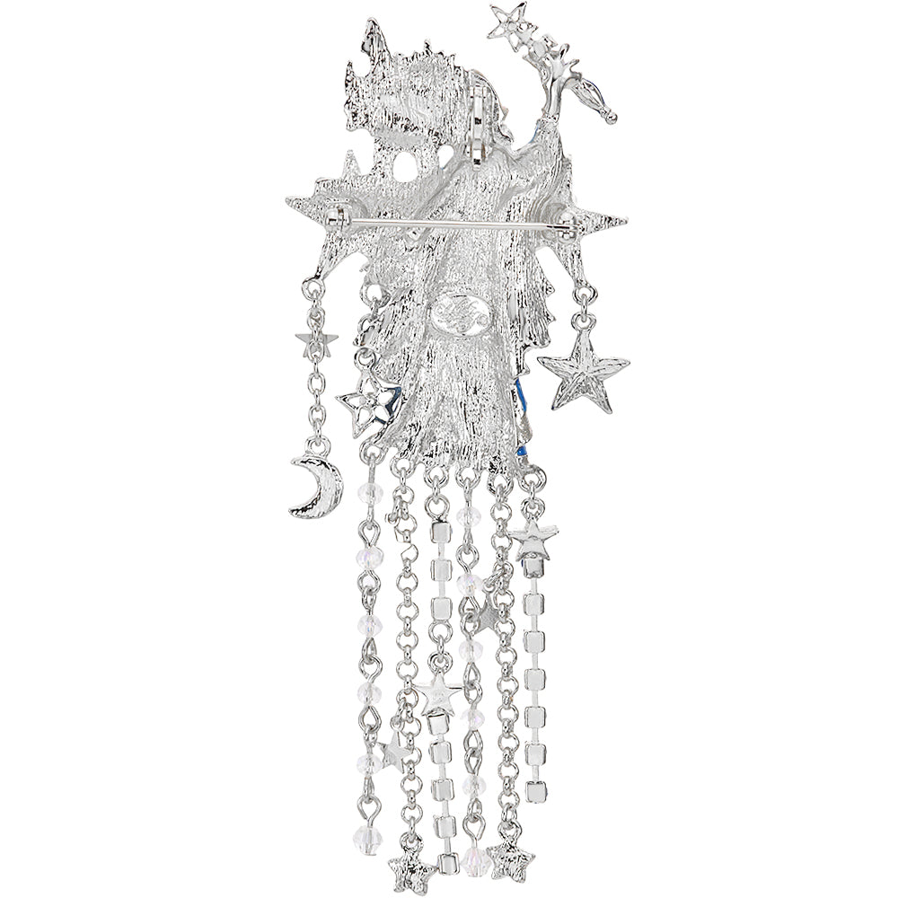 Cloaked in cosmic mystery, the Wizard King gazes from the heart of this pin pendant, his form encircled by crystal-encrusted stars and moons that shimmer like ancient spells.