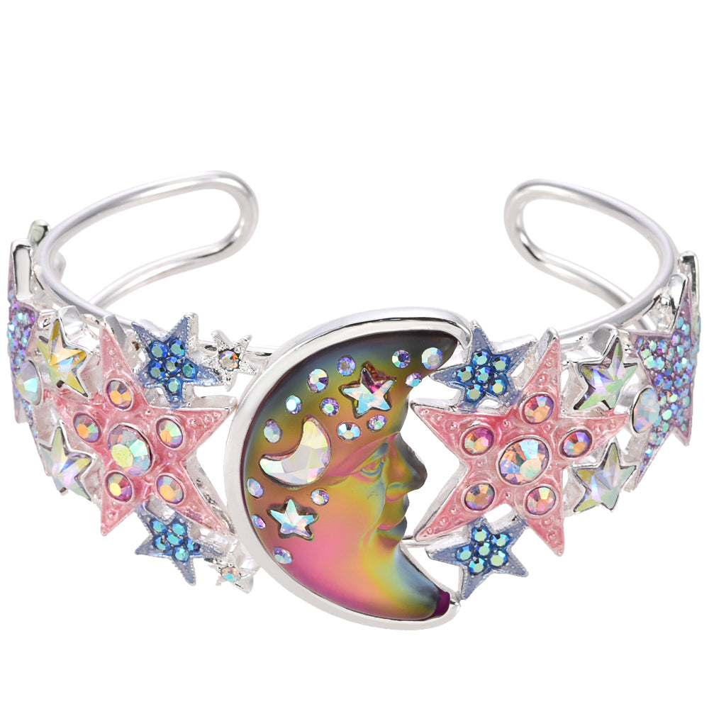 This celestial cuff bracelet features a luminous Seaview Moon stone, its serene face aglow with crescent moon and star shaped crystals.