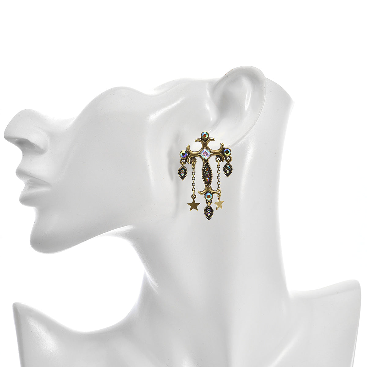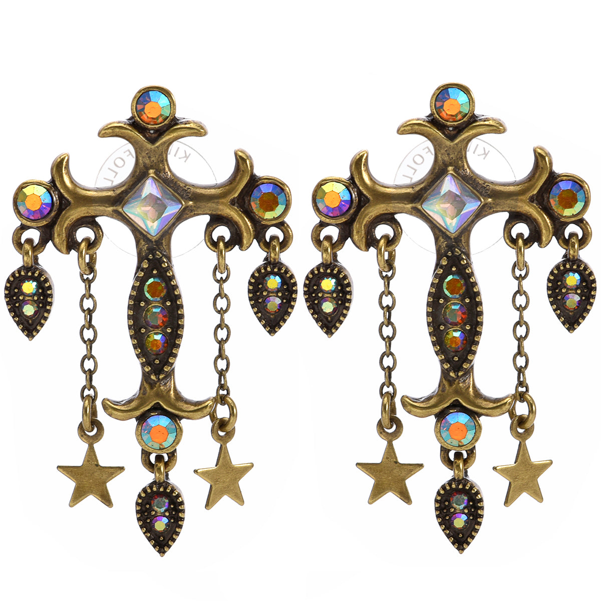 These pierced earrings showcase mystical crosses adorned with radiant aurora borealis crystals that shimmer like stardust in shifting light.