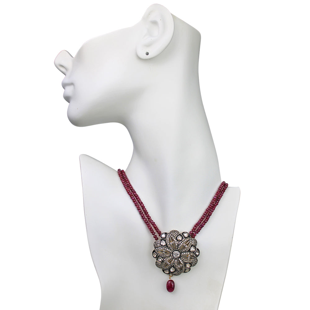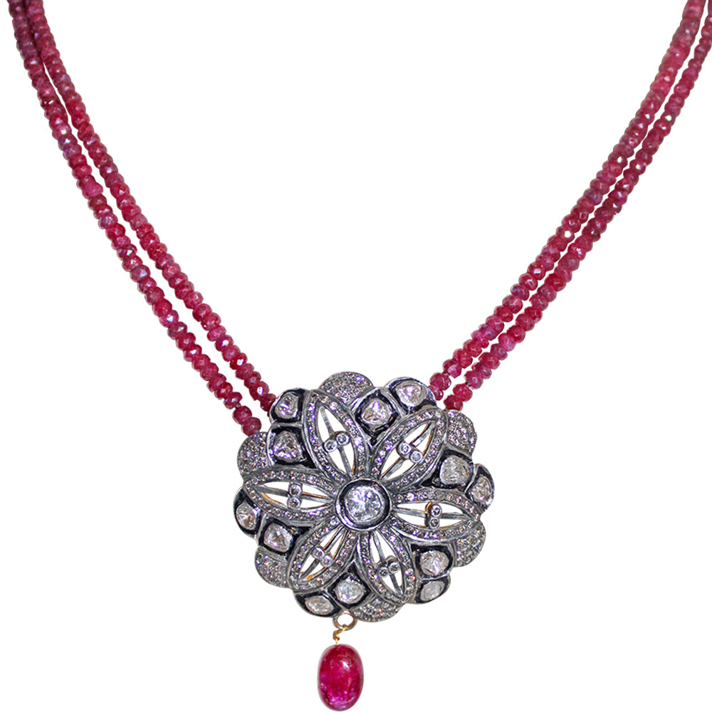 This luminous centerpiece is suspended from two strands of rubies, their crimson hues amplifying this necklace's striking brilliance with every movement.