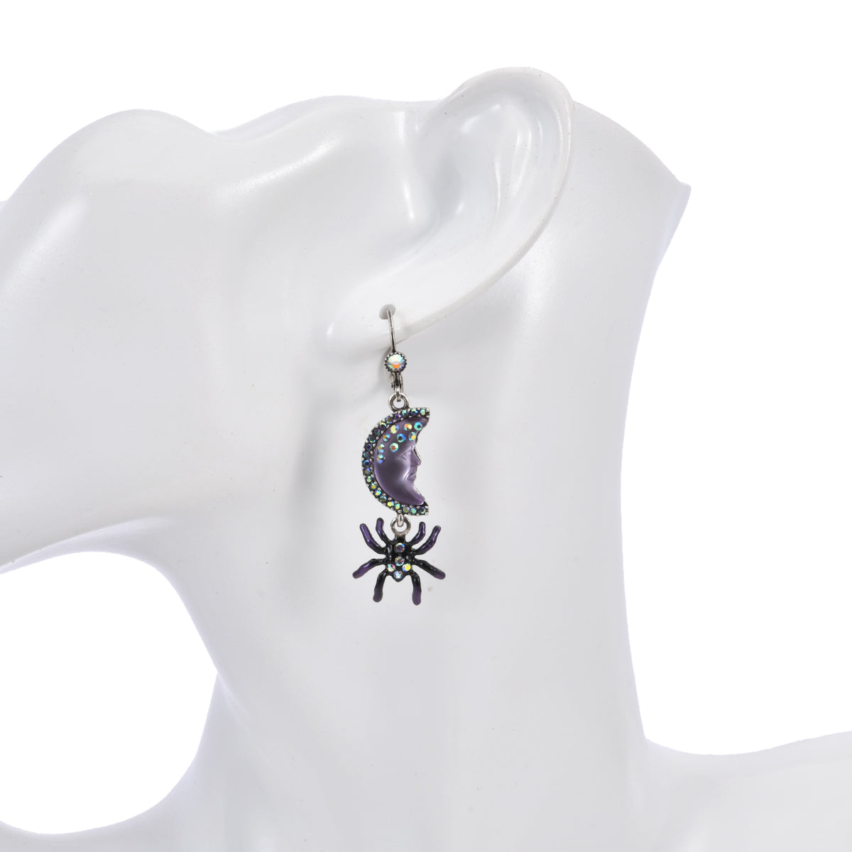 From each moon, a crystal-clad spider dangles like a glimmering whisper of midnight mischief, adding a touch of enchanted intrigue to every movement.