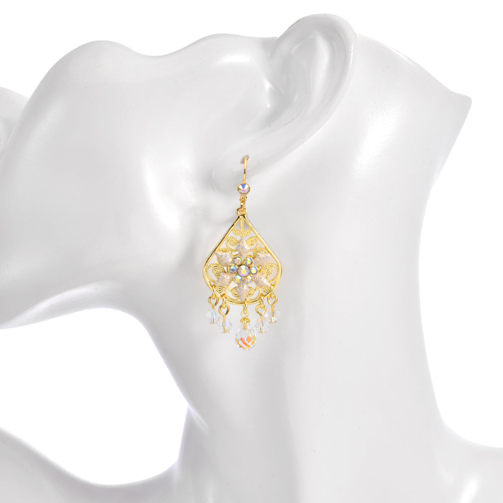Delicate snowflakes dance from these leverback chandelier earrings, each one sparkling with a cluster of aurora borealis crystals at its heart.