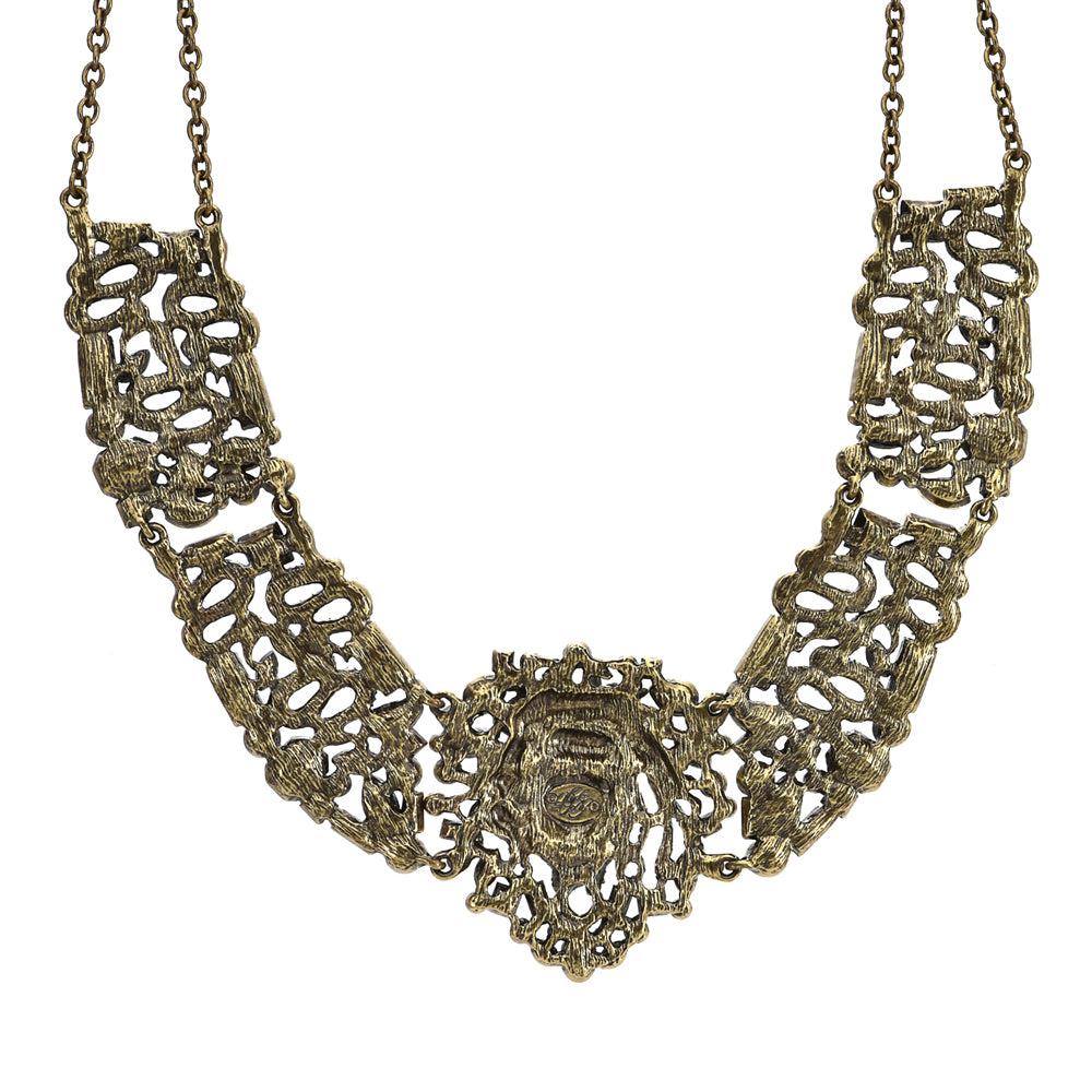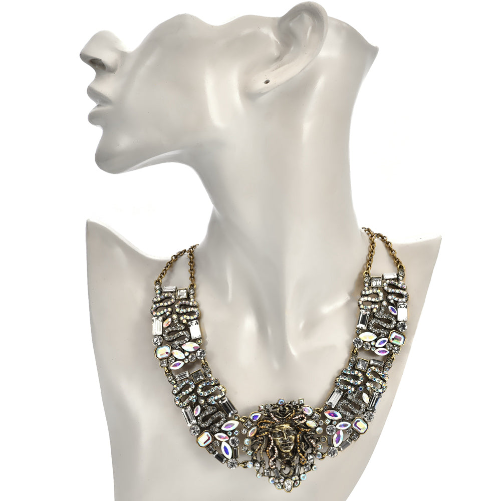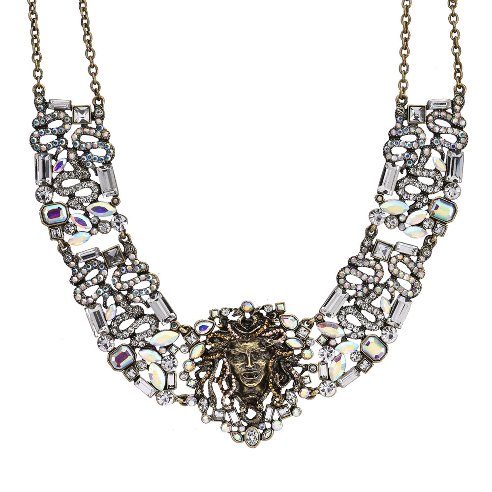 Medallions adorned with more serpents and fancy cut aurora borealis stones flank Medusa’s head and make this necklace a powerful talisman.