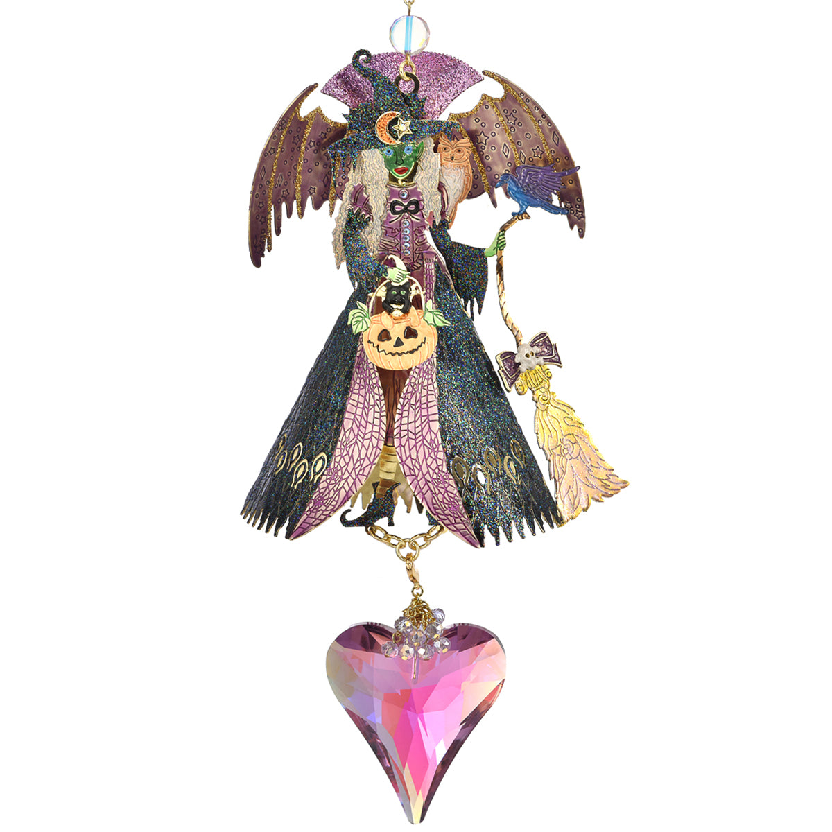 This ornament features a Divine Diva Witch and her enchanted broom, adorned with glistening details that shimmer like a moonlit Halloween night.