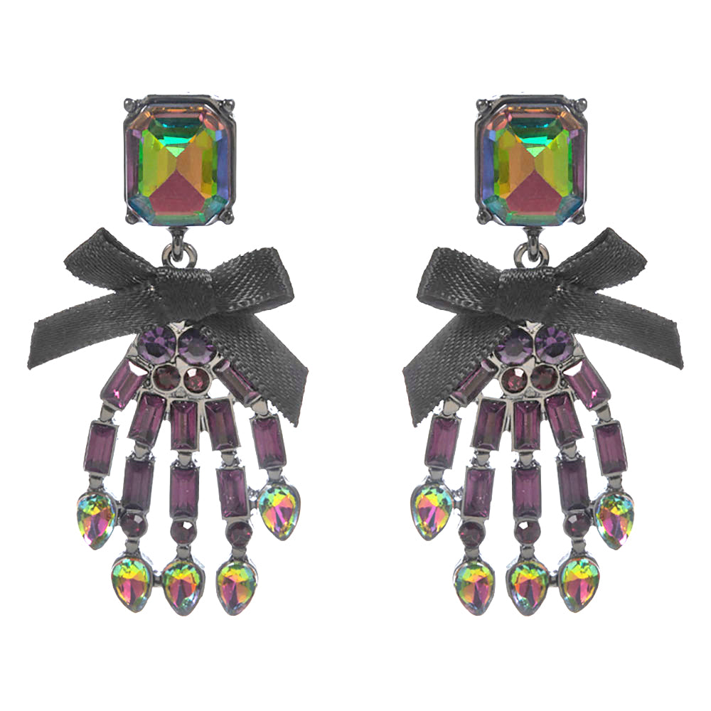 This pair of pierced earrings reveal Mrs. Bones Skeleton Hands sculpted from faceted amethyst-colored crystals, their violet hues eerily enchanting.