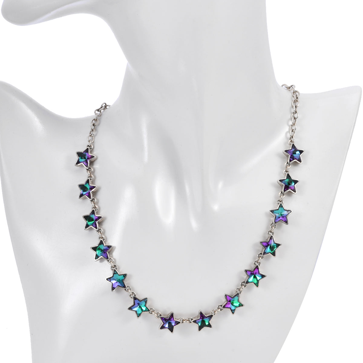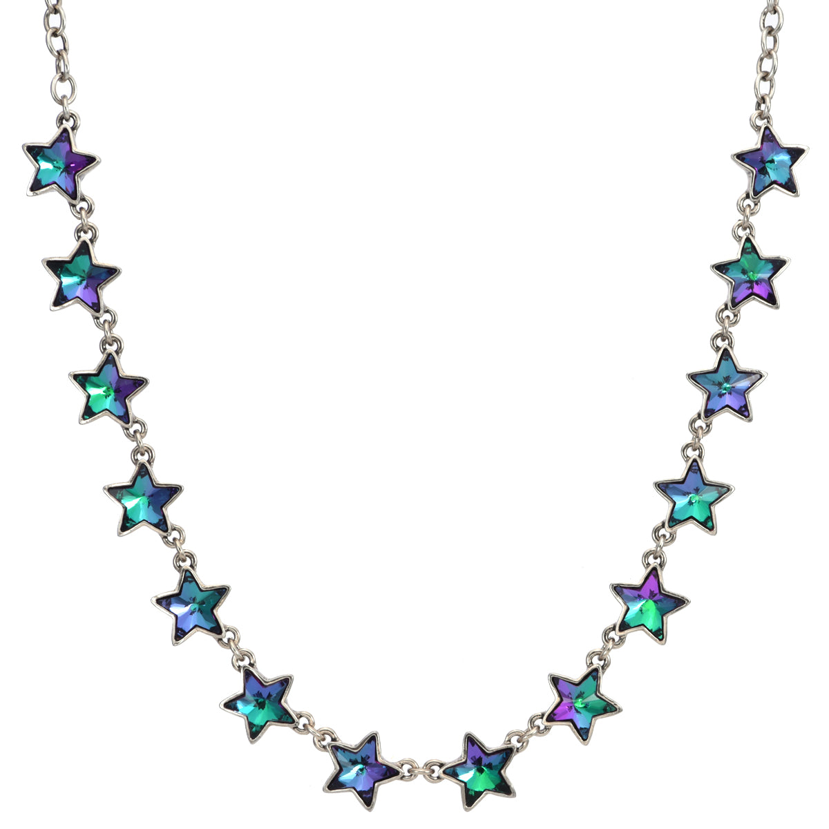 A constellation of faceted vitrail stars shimmer across this necklace, each crystal flickering with shifting hues like a shower of stardust caught in moonlight.