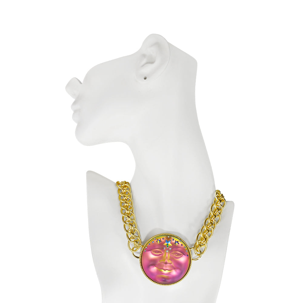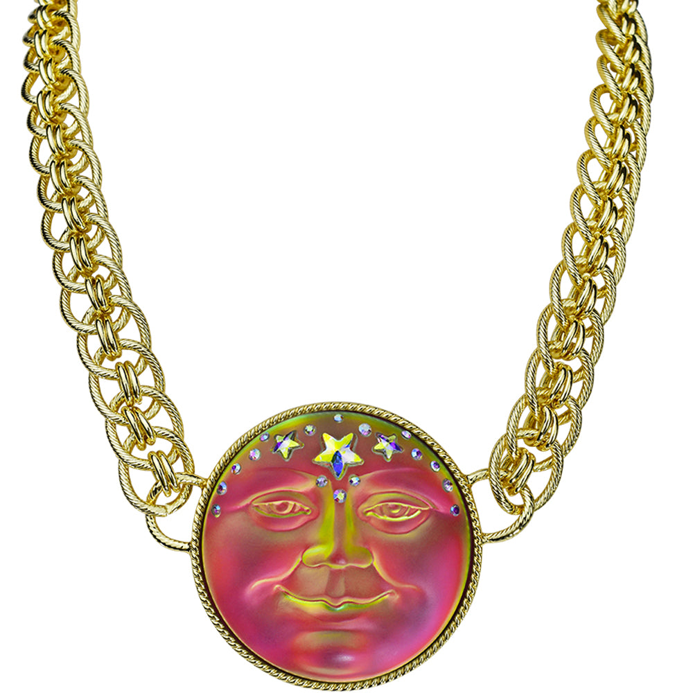 The chain holding the moon in place resembles metallic lace with intricately woven rings.