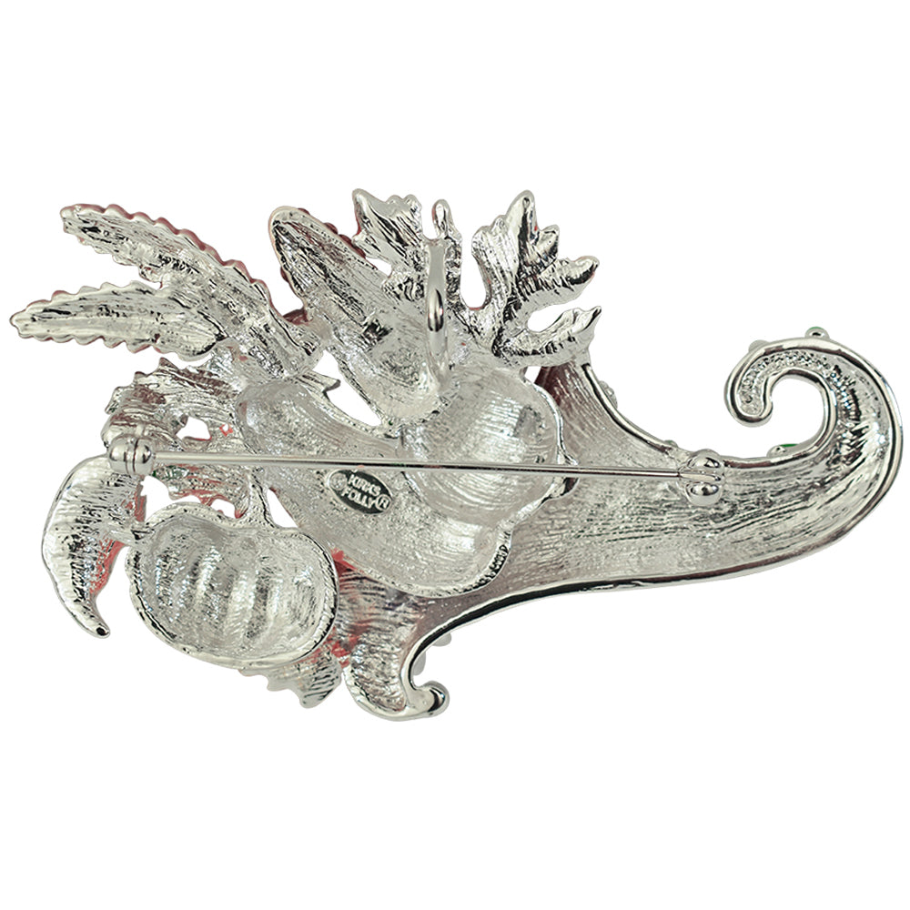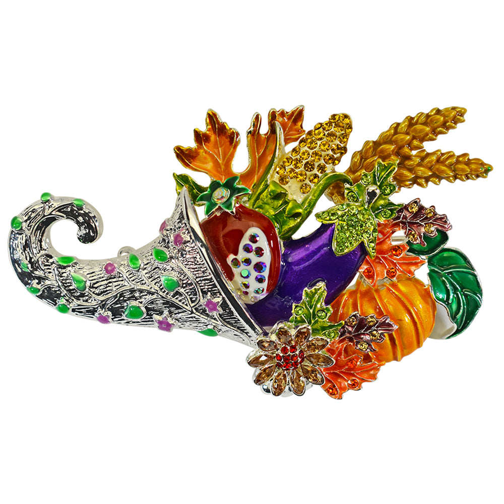 The brightly colored Cornucopia Pin Pendant features a vine covered traditional horn shaped basket overflowing with flowers, fruits and vegetables.