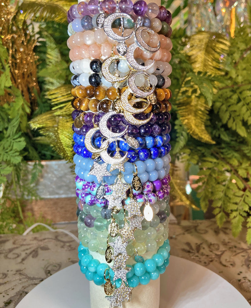 A beautiful heavenly crescent moon charm hangs from the beads. It is hand set with CZ stones that sparkle like diamonds.
