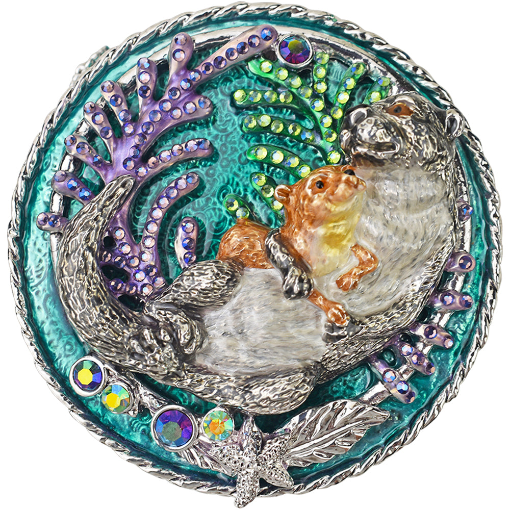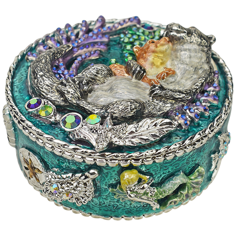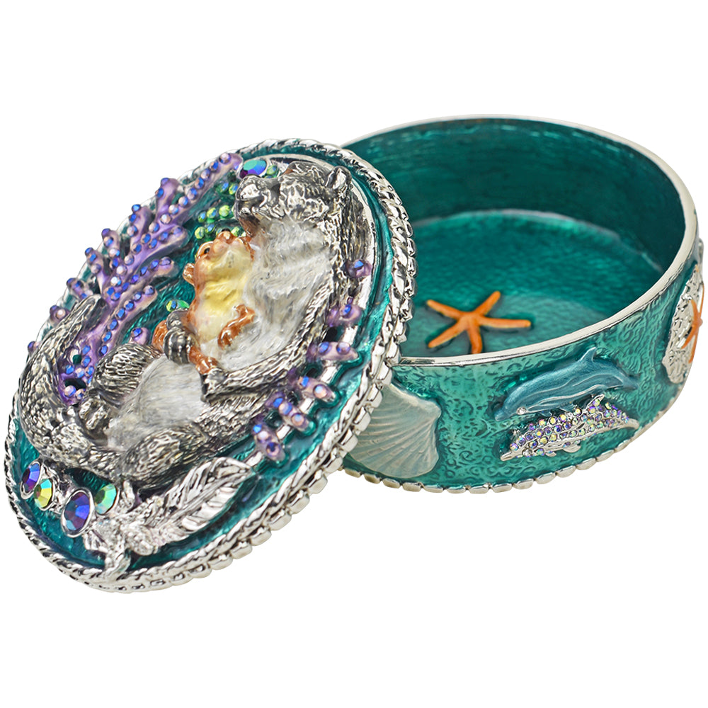 This trinket box unites a loving mother otter and her beloved pup floating in sparkling kelp beds.