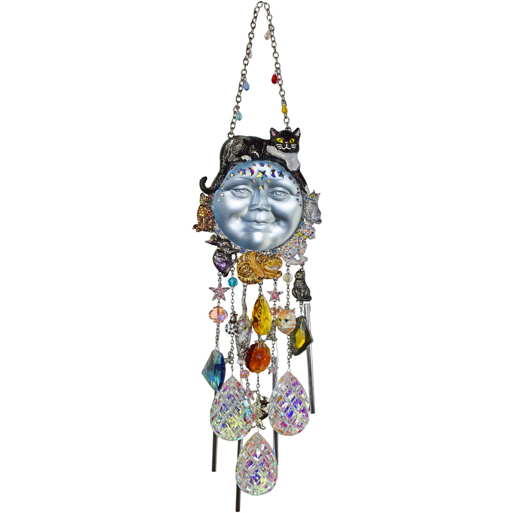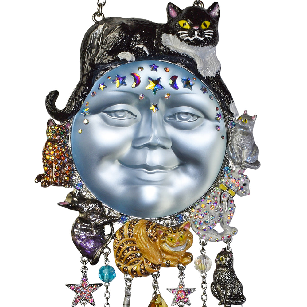 A clowder of cats are surrounding and meowing at a peaceful and serene moon on the Cat Lovers Windchime.